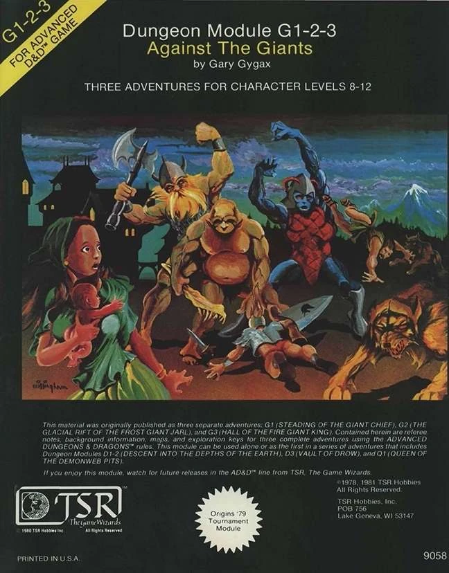 This material was originally published as three separate adventures: G1 (STEADING OF THE GIANT CHIEF), G2 (THE GLACIAL RIFT OF THE FROST GIANT JARL), and G3 (HALL OF THE FIRE GIANT KING). Contained herein are referee notes, background information, maps, and exploration keys for three complete adventures using the ADVANCED DUNGEONS & DRAGONS™ rules. This module can be used alone or as the first in a series of adventures that includes Dungeon Modules D1-2 (DESCENT INTO THE DEPTHS OF THE EARTH), D3 (VAULT OF THE DROW), AND Q1 (QUEEN OF HTE DEMONWEB PITS).